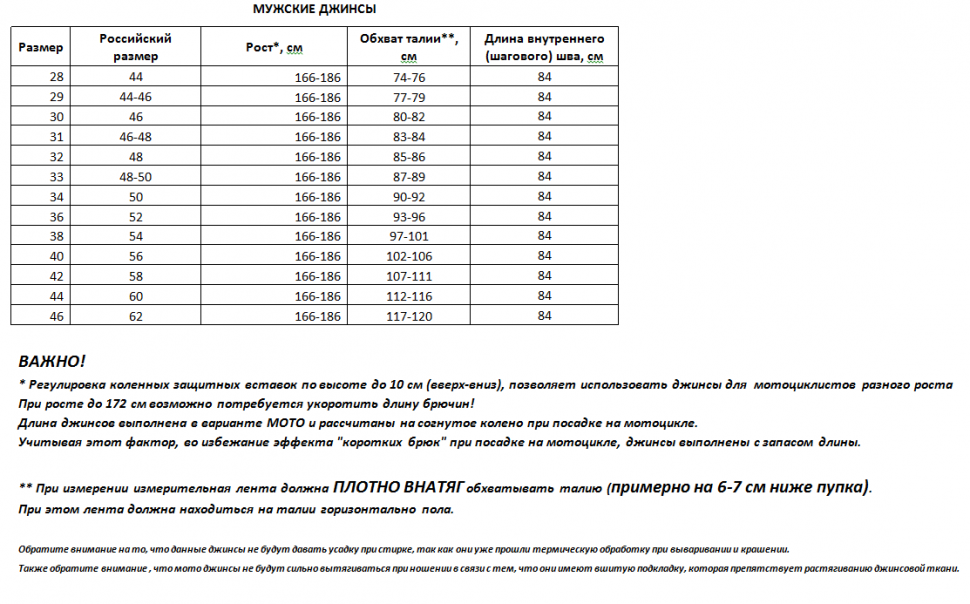 Мотоджинсы изготовлены с запасом длины штанин, что позволяет избежать эффекта «коротких штанов» при посадке на мотоцикле.