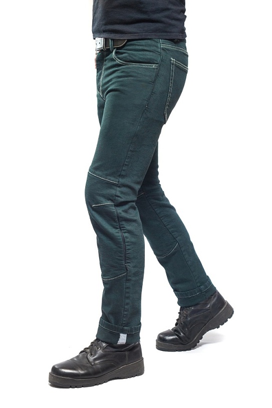 Мото джинсы как снаружи, так и внутри конструктивно выполнены в стиле МОТО, но при этом имеют максимально гражданский вид. Возможность монтажа защитных вставок колена снаружи делает их очень комфортными в использовании – элементы защиты можно снять, установить и отрегулировать по высоте, не снимая штанов.